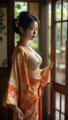POV, Looking down, korean mistress in kimono opening the front door, tanlines, tan lines, cleavage, blushing, (dark brown nipples), buxom, large breasts, saggy breasts, <lora:MJ52:.8>