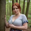 A red-haired, freckled mature chubby woman, (short straight wet hair), .very big boobs., (plaid shirt with sleeves rolled up at the forearms), . Huge breasts, large nipples., (strong large shoulders), . Very large lips., (The mouth is large, very thick-lipped.), ., (strong forearms), . Brown eyes., (wristwatch on one hand), (broad shoulders), (starts to undress), . Lustful look., (raised eyebrow), .Full length view.In the village. Forest.