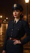 Beautiful female 1940s Chicago police officer, confident and determined with vintage charm. Slim yet strong build, fair skin, classic 1940s hairstyle tucked under a police cap, bold red lipstick, piercing eyes, large bimbo breasts. Wearing an authentic 1940s Chicago police uniform, tailored navy blue jacket, badge pinned to chest, short dark skirt, leather belt with holster. Standing under a flickering streetlamp on a rainy Chicago street smoke rising from a manhole. Ultra-realistic retro noir style, highly detailed, cinematic moody lighting, atmosphere of law, grit, and determination. Face down, lying on the ground, pinned down on ground, ass up, head pinned down, holding head, balls deep anal sex, anal penetration, large black man, (massive cock), interracial, anal creampie, held down