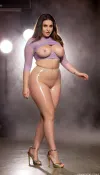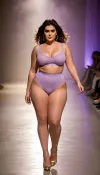 an Iranian curvy fashion model walking through light stage fog on a high-fashion runway, wearing a sheer lavender crop top and shimmery nude leggings, spotlight cutting through haze, gold heels, energetic runway music atmosphere sexy egs, big cameltoe, super busty, curvy sexy body, Big and wide hips., BadX, adjusting, footwear, high, heels, sexy, heel, 15, cm, boots, <lora:streephoto:1>, <lora:adjustingfootwear_XL_v1:1>, <lora:398313_training_data:1>