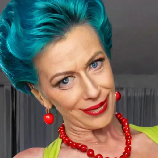 Very busty grandmother, Marge Simpson lookalike, oversized big breasts, perfect granny's curves, skinny Marge Simpson lookalike, blue beehive hairstyle, red pearls necklace, light green tight dress, "THE SIMPSONS" High quality photo, high detailed photo