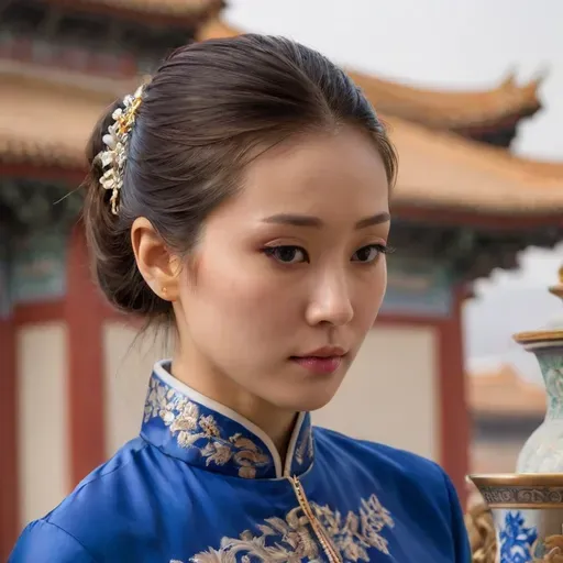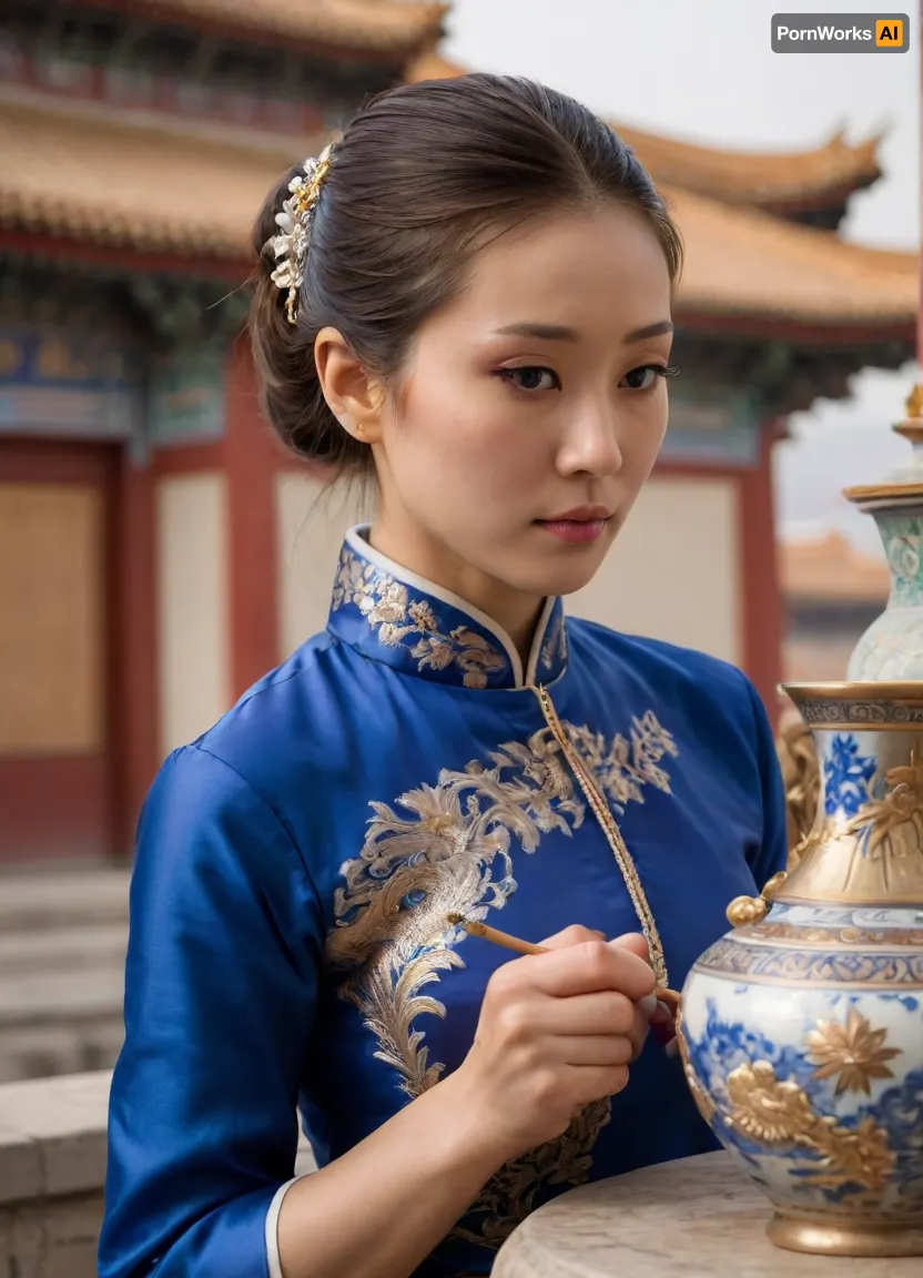 Chinese woman, 30s, painting a porcelain vase., (Dressed in a sapphire-blue silk qipao adorned with gold embroidery, she is focused), her dark eyes fixed on her work, (raw white porcelain vase with fine details visible), ., (Her skilled, gentle hands move with precision.), (Ceremonial courtyard of the palace, Forbidden City, Beijing, China), Full view of the palace in the background, (fine details, high contrast, great depth of field, presents an atmosphere of tranquility), . Sunlight streams in through the windows, casting soft shadows on the porcelain objects and enhancing the intricate details of the craftsmanship. The vase she is creating features dragon and phoenix designs in pastel hues. The style is realism, highlighting every tiny detail. The composition is a close-up, which focuses on the woman and her work, evoking a sense of serenity and China's rich cultural history., perfect, eyes, skin, blemish, detailed, Tattooist, <lora:polyhedron_all_sdxl-000004:.8>, <lora:artist_hands_SDXL:.8>