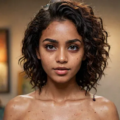 ((full body in picture)), oil picture of a powerful dark-skinned Indian girl, skinny body, muscular, naked, (splashed with paint:1.2), (standing in a dark indoor painting studio), ((paint spilled on body)), ((paintings of herself in room)), (black long curly hair), shy smile, detailed face, stacked busty, depth of field, moist lips, dark hair, realistic, very dark dark skin, detailed luminous brown eyes, (identical eyes), detailed skin, slight smile, center opening, official art, extremely detailed CG unity 8k wallpaper, perfect lighting, Colorful, Bright_Front_face_Lighting, shiny skin, (masterpiece:1), (best_quality:1), ultra high res, 4K, ultra-detailed, photography, 8K, HDR, highres, (absurdres:1.2), Kodak portra 400, film grain, blurry background, (bokeh:1.2), lens flare, (vibrant_color:1.2), professional photograph, (beautiful_face:1.5), cinematic, great shading, moody lighting, cloudy weather, (by Hope Gangloff:1), perfecteyes, Movie, Still, Film, Cinematic, Shot, Lighting, <lora:lora-sdxl-perfect-eyes:.5>, <lora:JuggerCineXL2:.5>, <lora:add-detail-xl:1>, <lora:milkers_v2:.5>
